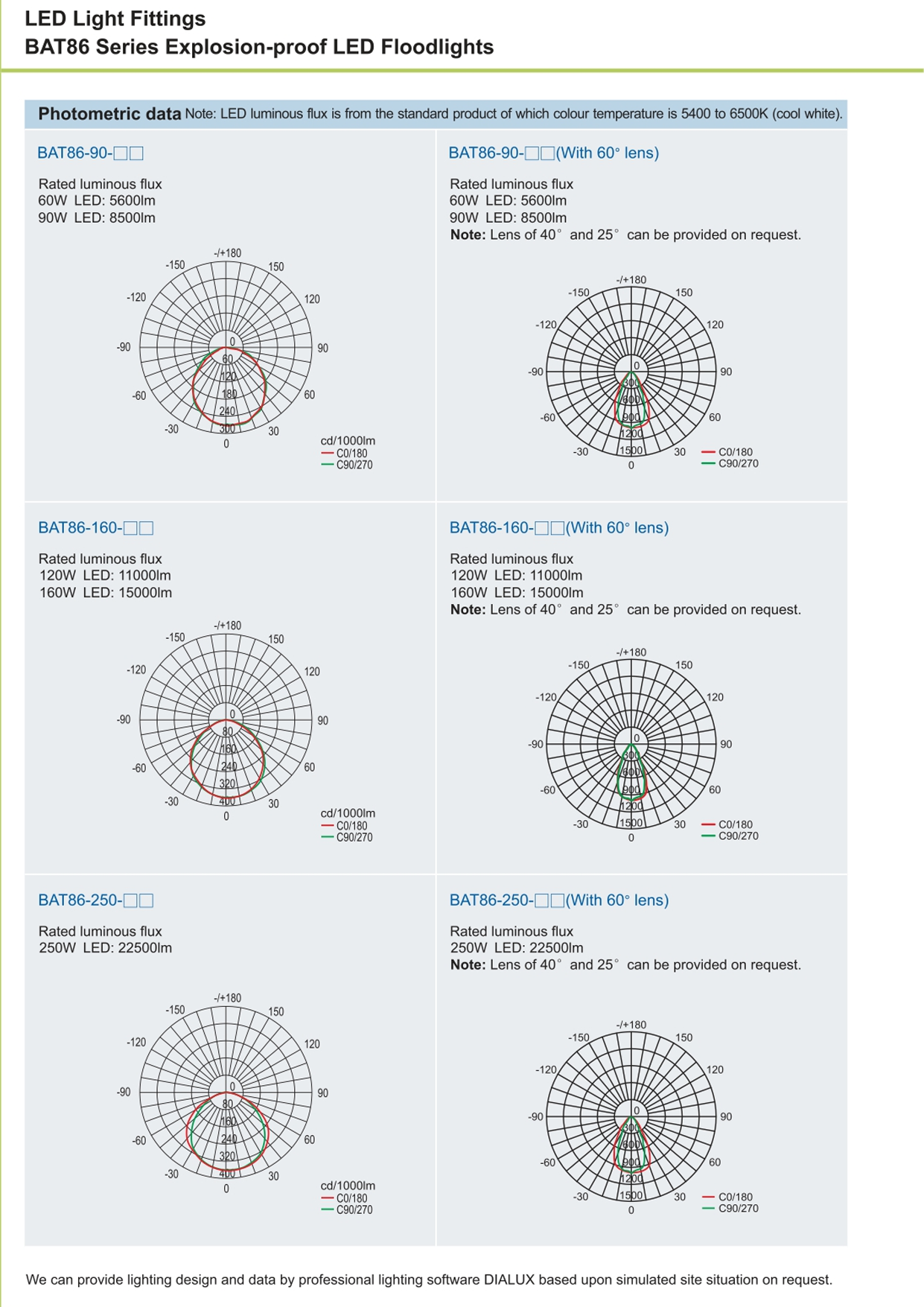 - Standard product is a floodlight; spotlight lenses of 40° or 60° can be provided on request.