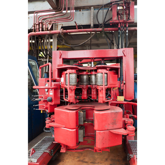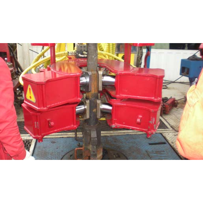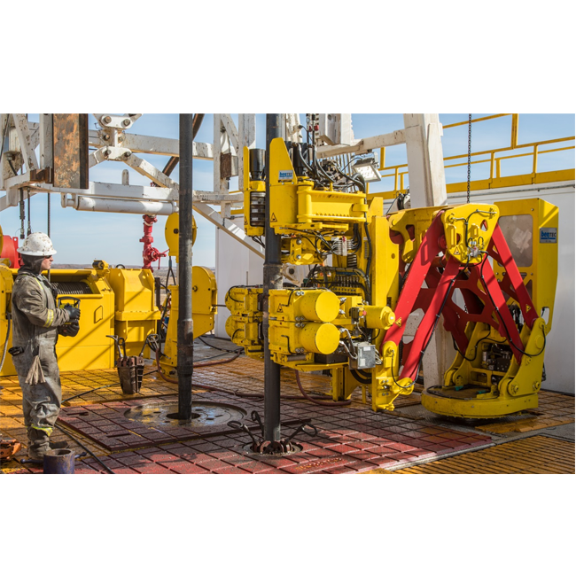 The TZG216/110 iron roughneck is an oil-rig tool used for make-up and break-out of drilling tubular connections. Designed for use on smaller rigs where floor space is limited, the durable TZG216/110 iron roughneck features a extend/retract scissor-arm system and is available in standard and tall models. With the tall pedestal iron roughneck model, the operator has the capability of raising the iron roughneck above the deck crew’s head in the parked position. Thus, the TZG216/110 allows clearance around well center and mousehole both during use and when placed in the parked position.