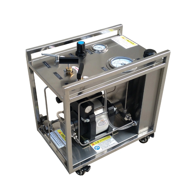 The fluid pressurized control cabinet has been equipped with the fluid booster pump,the drive air water filter,the pressure regulator valve, Pressure gauges and manual pressure relieve valve. The main parts of the equipment are assembled in closed stainless steel cabinet or stainless steel frames. The pressure gauge,valve and pressure regulator will be mounted on the panel. The corresponding sign will also be marked on the panel.